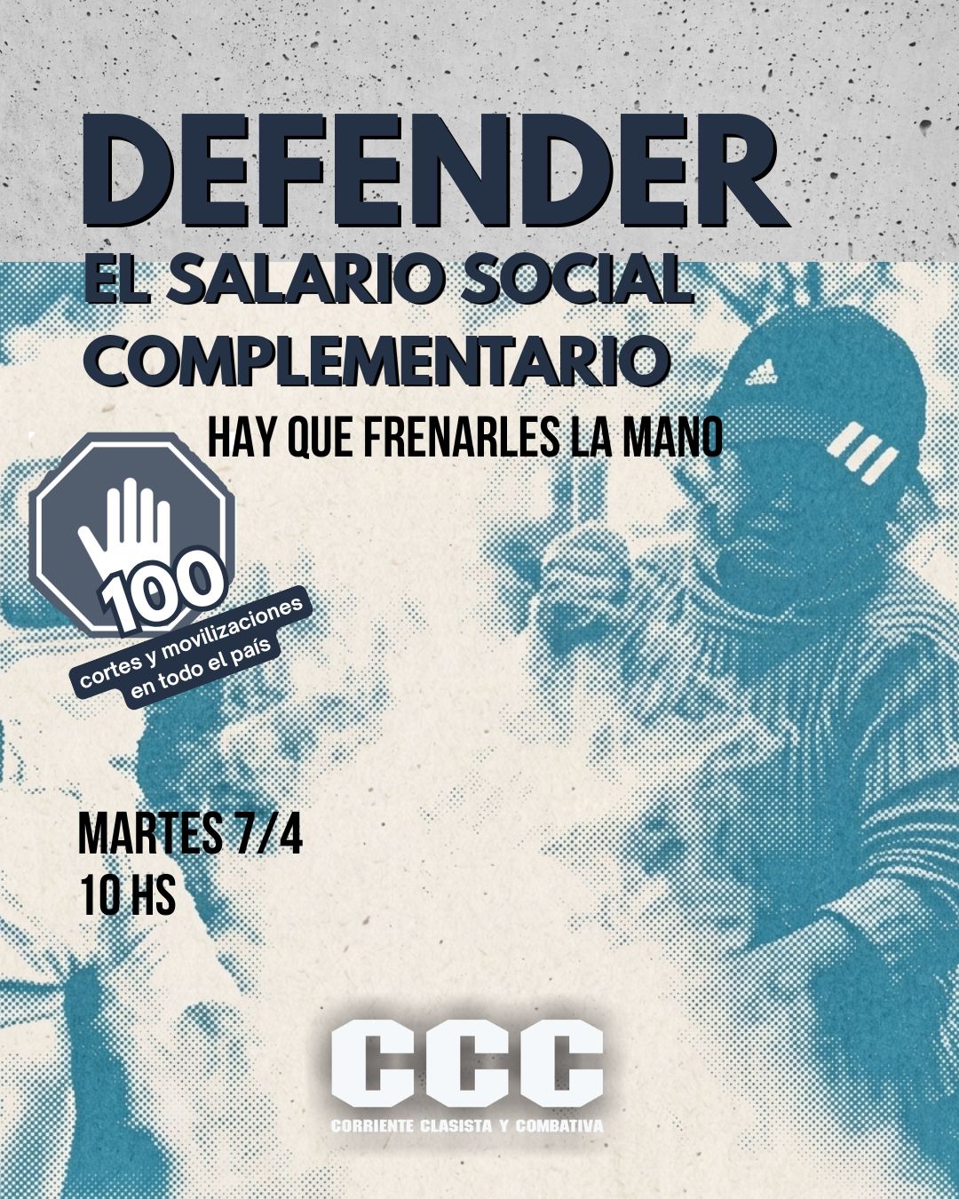 ESPECIAL PARA ENTREVISTAS Fuente: Prensa Corriente Clasista y Combativa (CCC) JORNADA DE RECLAMOS Y PROTESTAS EN TODO EL PAÍS POR EL CIERRE DEL PROGRAMA VOLVER AL TRABAJO HOY MARTES 07/ABRIL desde las 10:00 organizaciones sociales, piqueteras y sindicales, entre ellas la Corriente Clasista y Combativa (CCC) realizarán una Jornada de Reclamos y Protesta, con movilizaciones y cortes en todo el país, por el anuncio del gobierno nacional del cierre del programa Volver al Trabajo que afectará a más de 900.000 trabajadores de la Economía Popular. GACETILLAS: 01 02 | IMAGEN ------------------------------------------------------------------------- "Con esta medida, sumada a los miles de fábricas y comercios que cierran sus puertas a diario, solo agravara la desocupación y la falta de empleo que sufren millones en la Argentina con el consecuente crecimiento de la pobreza y el hambre. La Organizaciones Populares entendemos que este ataque del gobierno es un claro intento de desarticulación de la red comunitaria que nuestro pueblo creo en los barrios populares y que hoy son un dique de contención contra el avance del narcotráfico y el delito organizado. que, ante la falta de oportunidades en las vidas de nuestros pibes, pretende cooptarlos como carne de cañón..." -------------------------------------------------------------------------
