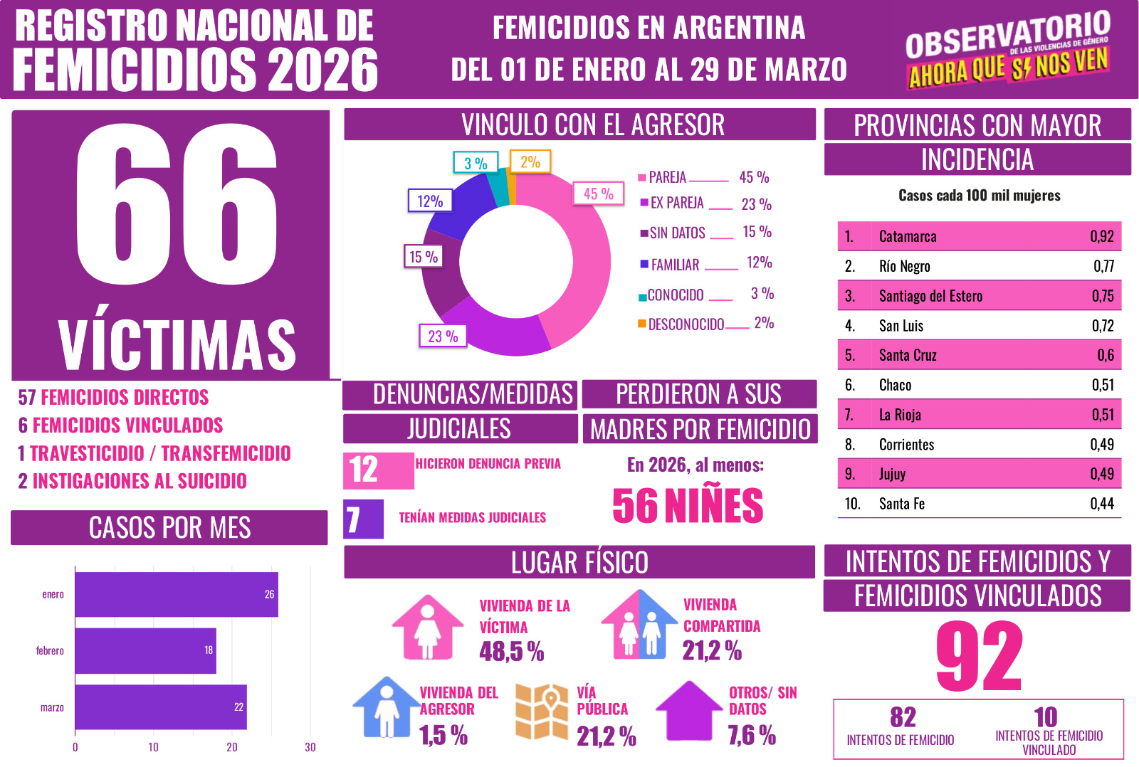 ESPECIAL PARA ENTREVISTAS Fuente: Prensa Observatorio "Ahora Que Sí Nos Ven" 66 VÍCTIMAS FATALES DE LA VIOLENCIA DE GÉNERO EN LO QUE VA DE 2026 El Observatorio de las violencias de género "Ahora Que Sí Nos Ven" se refirió con preocupación a las cifras que indican 66 víctimas fatales de la violencia de género en lo que va de 2026. Entre el 1 de enero y el 29 de marzo relevamos 66 víctimas fatales: 57 femicidios directos, 6 femicidios vinculados, 2 instigaciones al suicidio y 1 travesticidio/transfemicidio. GACETILLA | IMAGEN ------------------------------------------------------------------------- Raquel Vivanco (Directora del Observatorio "Ahora Que Sí Nos Ven"): "En un contexto de ajuste, vaciamiento de políticas públicas y discursos negacionistas, nuestras vidas siguen en riesgo. Los 66 casos en lo que va del año muestran que muchos podrían haberse evitado. Como el caso de Juliana Frías (37) y su hija Diana Gómez (17), asesinadas en Quitilipi (Chaco) por la ex pareja de Juliana, David Ojeda. Un crimen atravesado por la violencia extrema y el ensañamiento. No son hechos aislados, son parte de una trama estructural sostenida por la desidia y la impunidad estatal..." ------------------------------------------------------------------------- CONTACTOS: -Raquel Vivanco, 113-068-1345 -Alfonsina Silvestri, 2494 001928 -------------------------------------------------------------------------