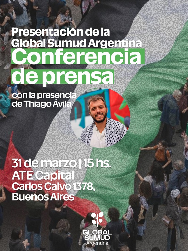 ESPECIAL PARA ENTREVISTAS + COBERTURA MOVIL Fuente: Prensa Global Sumud Argentina CONFERENCIA DE PRENSA - LANZAMIENTO GLOBAL SUMUD ARGENTINA HOY MARTES 31/MARZO (15:00, en el Auditorio de ATE Capital, Carlos Calvo 1378, CABA) se realizará la Conferencia de prensa sobre el lanzamiento de Global Sumud Argentina, el movimiento internacionalista global de acción no violenta y solidaria que busca romper el bloqueo ilegal de Israel en Gaza. GACETILLA | IMAGEN --------------------------------------------------------------------------- “Extendemos la invitación a todos los medios de comunicación del país a una conferencia de prensa que contará con la participación del mundialmente reconocido activista Thiago Ávila, coordinador internacional de la Global Sumud Flotilla. Allí, Ávila y otros activistas locales e internacionales darán detalles sobre el espacio y sobre la próxima misión, la más grande de la historia reciente, que con militantes de Argentina y todo el planeta movilizará una flota de más de 100 barcos por el Mar Mediterráneo, así como una caravana terrestre con cientos de camiones a través del Norte de África. --------------------------------------------------------------------------- CONTACTO P/NOTAS: -Oda Cuentas, 112-739-0035 (Prensa) ---------------------------------------------------------------------------