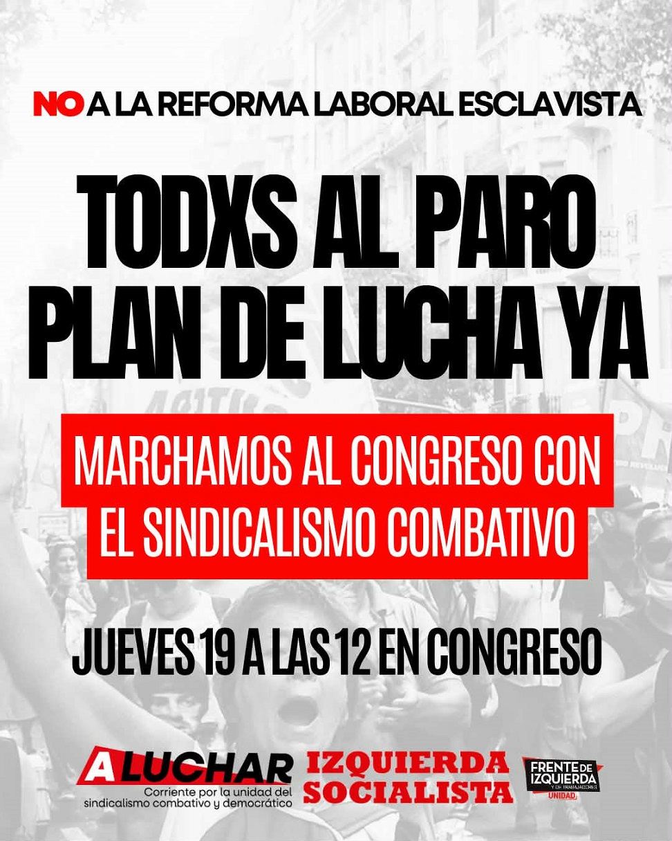 ESPECIAL PARA ENTREVISTAS + COBERTURA MÓVIL Fuente: Prensa Izquierda Socialista CONFERENCIA DE PRENSA DEL SINDICALISMO COMBATIVO “PARAMOS EL 19, MARCHAMOS AL CONGRESO Y EXIGIMOS PLAN DE LUCHA” ESTE MIÉRCOLES 18/FEBRERO (12:00) el Plenario del Sindicalismo Combativo (PSC), los movimientos piqueteros independientes y de jubilados en lucha, darán una conferencia de prensa frente al Congreso para fijar postura ante el paro general de la CGT contra la REFORMA LABORAL. Estarán referentes de la Unión Ferroviaria Seccional Oeste y de Izquierda Socialista, Rubén “Pollo” Sobrero y la diputada Mónica Schlotthauer, el Sutna, Ademys, AGD UBA, ATE Mecon, Junta Interna del Garrahan y distintos sectores en lucha. GACETILLA | IMÁGENES: 01 02------------------------------------------------------------------------- Rubén Pollo Sobrero y Mónica Schlotthauer: “Paramos el 19, marchamos al Congreso y exigimos plan de lucha... Llamamos a hacer un gran paro este jueves si se trata la reforma laboral. Desde el sindicalismo combativo nos vamos a movilizar, concentrándonos a las 12 horas frente al Congreso para hacer un acto reclamando a la CGT un plan de lucha nacional hasta derrotarla... La reforma laboral es tan brutal que al gobierno se le complicó hasta con sus propios socios del PRO y de la CGT..." ------------------------------------------------------------------------- CONTACTOS P/NOTAS: -Mónica Schlotthauer, 116-458-5777 -Rubén “Pollo” Sobrero, 116-422-6661 -Prensa de Izquierda Socialista, 116-054-0129 -------------------------------------------------------------------------