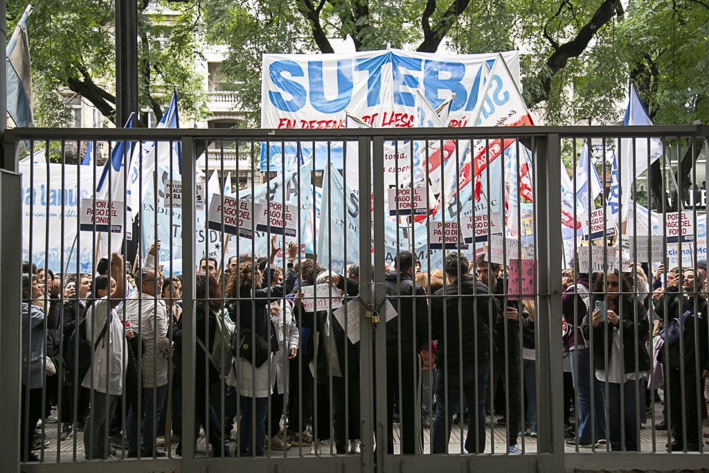 FUERTE MOVILIZACIÓN FRENTE A LA SECRETARÍA DE TRABAJO PARA EXIGIR UNA PARITARIA NACIONAL JUSTA En el marco de la Paritaria Nacional Docente, de la que participó la CTERA, delegaciones del SUTEBA realizaron una fuerte movilización, frente a la Secretaría de Trabajo, en CABA, para exigir una paritaria justa. Los docentes portaban carteles que decían "Basta de corrupción - Plata para Educación" y "Hagan los deberes: paguen la deuda con la Educación a las Provincias". GACETILLA | IMÁGENES: 01 02 03 04------------------------------------------------------------------------ Roberto Baradel (Sec. Gral del SUTEBA): "Intentan hacer una farsa de este ámbito, pero no se lo vamos a permitir. Vamos a seguir sosteniendo la Paritaria Nacional Docente porque fueron muchos años de lucha. Para sumar al desmantelamiento que están llevando adelante, nos hacen una propuesta de piso salarial por debajo de lo que están pagando cada una de las provincias". ------------------------------------------------------------------------