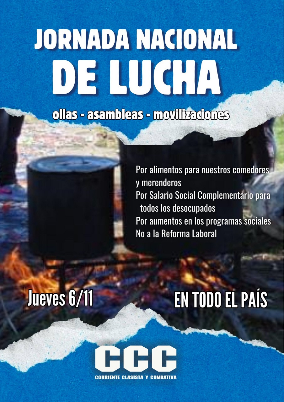 Jueves 06 de noviembre 2025DIFUSIÓN ESPECIAL P/NOTAS Y COBERTURA MOVIL Fuente: Prensa Corriente Clasista y Combativa (CCC) JORNADA NACIONAL DE OLLAS POPULARES, ASAMBLEAS Y MOVILIZACIÓNES HOY JUEVES 6/NOVIEMBRE desde las 11:00 decenas de Movimientos Populares, entre ellos la Corriente Clasista y Combativa (CCC), realizarán una Jornada Nacional de ollas populares, asambleas y movilizaciones en reclamo de respuestas al Gobierno Nacional para los sectores más postergados de la sociedad. GACETILLA | IMAGEN ----------------------------------------------------------------------- RECLAMO: Urgente asistencia alimentaria a los comedores y merenderos populares, salario social para todos los desocupados, sostenimiento de los programas social, urgente aumento salarial, urgente implementación de políticas públicas que frenen el crecimiento de las adicciones. ----------------------------------------------------------------------- EN CABA: MOVILIZACIÓN AL MIN. DE CAPITAL HUMANO EN TODO EL PAÍS: MOVILIZACIONES A PLAZAS Y RUTAS ----------------------------------------------------------------------- CONTACTOS P/NOTAS: -Ramiro "Vasco" Berdesegar, 221 616-4265 -Liliana Ruiz, 115-844-0435 -----------------------------------------------------------------------