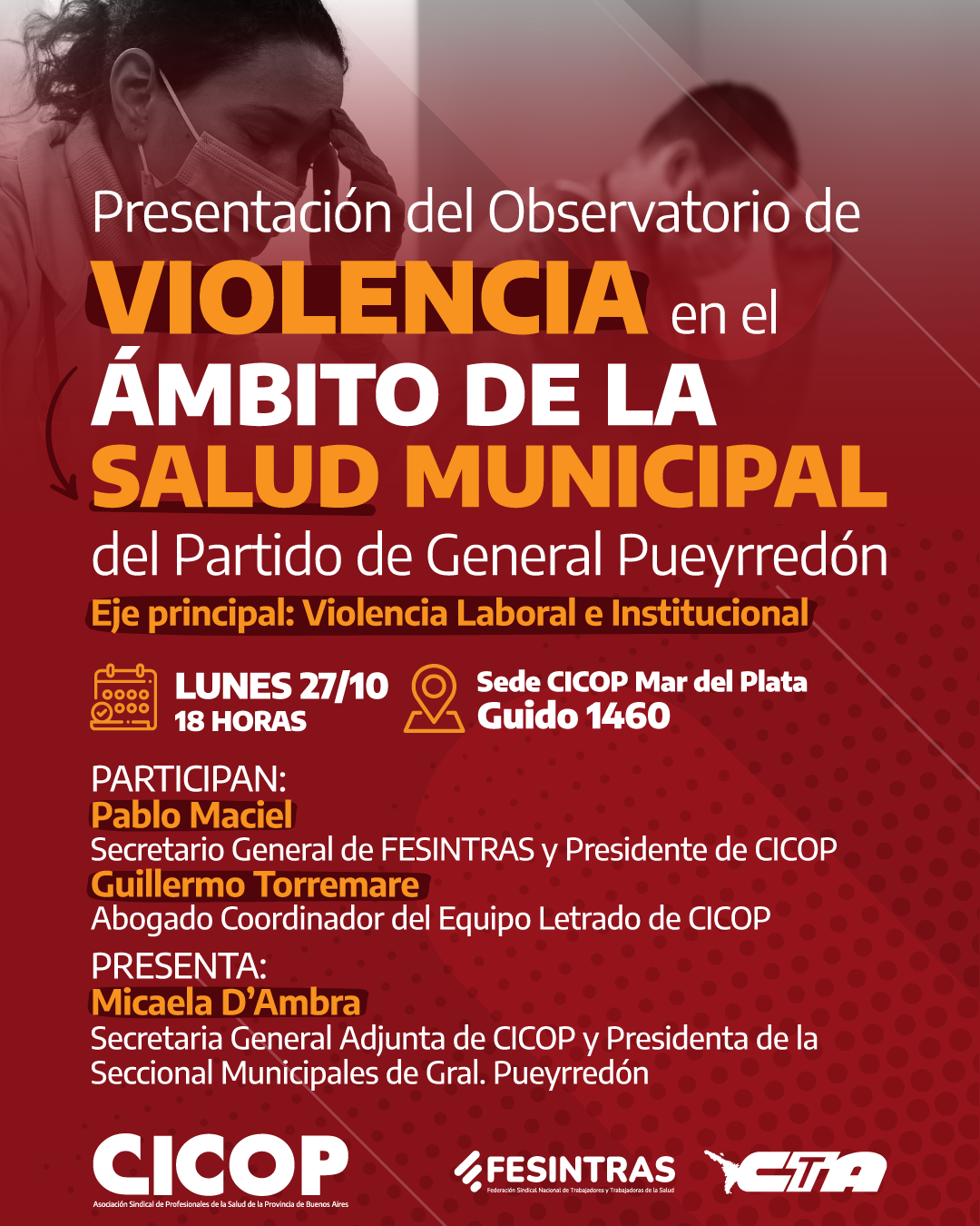 ESPECIAL PARA ENTREVISTAS Fuente: FESINTRAS FESINTRAS REUNIÓ A SU CONSEJO EJECUTIVO NACIONAL Y DEFINIÓ UNA AGENDA DE LUCHA EN DEFENSA DE LA SALUD PÚBLICA Y LOS DERECHOS LABORALES La Federación Sindical Nacional de Trabajadores y Trabajadoras de la Salud (FESINTRAS) integrado por los gremios de la Salud CICOP de Buenos Aires, APUAP de Jujuy y APHEC del Hospital Cruce, realizó una nueva reunión de su Consejo Ejecutivo Nacional, donde representantes sindicales de la salud de distintos puntos del país debatieron la situación político-gremial y aprobaron una agenda de lucha en defensa de la Salud Pública y los derechos laborales. GACETILLA | DECLARACIÓN | IMÁGENES: 01 02 03 04 05 ----------------------------------------------------------------------- Pablo Maciel (Secretario General de FESINTRAS): "La Federación también analizó el nuevo escenario político tras las elecciones de medio término del 26 de octubre, advirtiendo sobre el impacto del triunfo de La Libertad Avanza y denunciando la injerencia extranjera en los procesos políticos y económicos nacionales, reafirmando su compromiso con la soberanía y la independencia de las políticas públicas". ----------------------------------------------------------------------- CONTACTO P/NOTAS: -Pablo Maciel, 221 615-2772 (Presidente de CICOP - Buenos Aires) -Nicolás Fernández, 388 437-6049 (Sec. General de APUAP - Jujuy) -Eliana Comas, 221 455-1397 (Prensa FESINTRAS) -----------------------------------------------------------------------