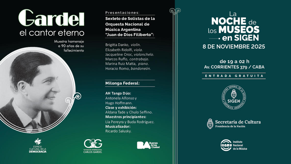 Miércoles 05 Noviembre 2025DIFUSIÓN ESPECIAL P/NOTAS + COBERTURA MÓVIL Fuente: Prensa Sindicatura General de la Nación (SIGEN) LA SIGEN OFRECE UNA PROPUESTA DE TANGO EN LA NOCHE DE LOS MUSEOS 2025 la Sindicatura General de la Nación (SIGEN), a través de su Espacio Cultural, ofrece una propuesta de tango y milonga, en la Noche de los Museos, que se realizará el SÁBADO 08/NOVIEMBRE (19:00 a 02:00) en Av. Corrientes 379. Se presentará el Sexteto de Solistas de la Orquesta Nacional de Música Argentina "Juan de Dios Filiberto" y la Milonga Federal con clases de tango abiertas al público, músicos en vivo y exhibición de bailarines. Todo esto en el marco de la muestra "Gardel, el cantor eterno", un homenaje al Zorzal Criollo, a 90 años de su fallecimiento. GACETILLA | IMAGEN ----------------------------------------------------------------------- La Noche de los Museos en la SIGEN es una propuesta de lujo a puro tango sobre la mítica calle Corrientes, un escenario bien porteño para bailar y disfrutar del ritmo y la pasión tanguera, esa que nos hace sentir bien orgullosos del género musical que nos representa en el mundo entero. ----------------------------------------------------------------------- CONTACTO P/NOTAS: -Prensa SIGEN, 4317-2700 int. 2933 / 2966 -----------------------------------------------------------------------