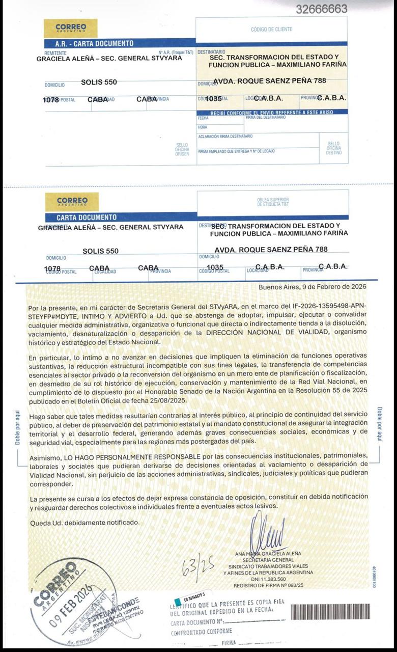 ESPECIAL PARA ENTREVISTAS Fuente: Agencia Noticias Argentinas VIALES DECLARAN EL ESTADO DE ALERTA Y MOVILIZACIÓN CONTRA LA REFORMA LABORAL Y NO DESCARTAN MEDIDAS DE ACCIÓN DIRECTA El Sindicato Trabajadores Viales y Afines de la República Argentina (STVyARA), que lidera Graciela Aleñá, declaró el Estado de Alerta y Movilización y la posibilidad de medidas de acciones directa contra el proyecto de reforma laboral, y por el grave congelamiento salarial que atraviesan los trabajadores viales desde octubre de 2024. Adelantaron que las medidas anunciadas comenzarán a implementarse durante Febrero, mediante la abstención de tareas y la movilización de los trabajadores, entre otras. GACETILLA | IMAGEN -------------------------------------------------------------------------- Graciela Aleñá:: "Este proyecto no contiene una sola cláusula que genere un mejor beneficio para los trabajadores, para el desenvolvimiento de la legítima acción sindical o fortalecimiento del sistema de la seguridad social... Es una vulneración de derechos humanos laborales... Llevaremos adelante las medidas pertinentes para “demostrar nuestra clara posición de rechazo por nuestra entidad gremial...” -------------------------------------------------------------------------- CONTACTOS P/NOTAS: -Graciela Aleñá, 116-903-3195 (Sec. General de STVA) -Gabriel Padula, 115-708-0106 (Prensa) -Lisandro Machado Zubeldia, 113-632-1200 (Prensa) -Magalí Laboret, 116-350-0746 (Prensa) --------------------------------------------------------------------------
