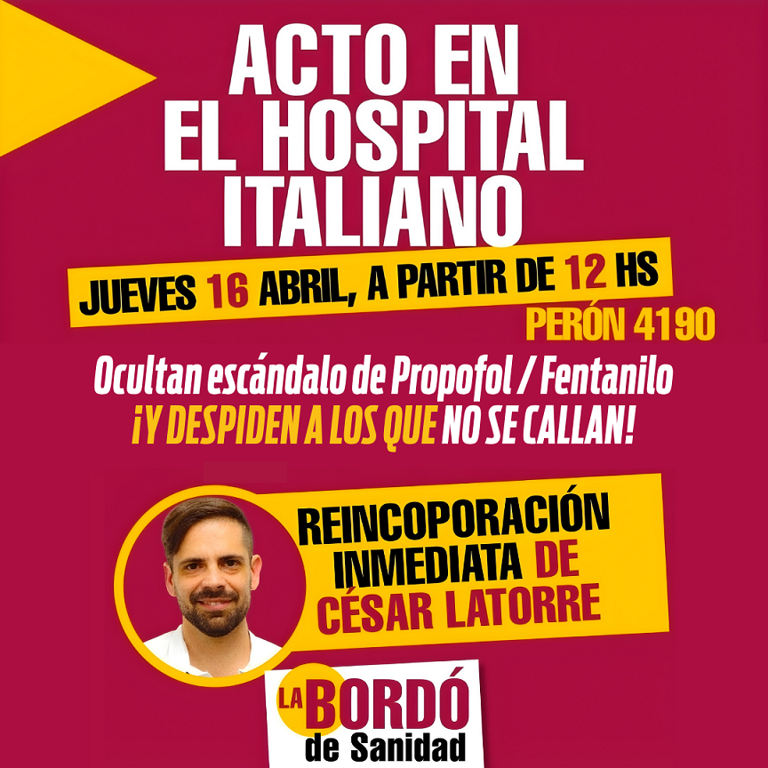 Miércoles 15 Abril 2026NUEVO | ESPECIAL PARA ENTREVISTAS + COBERTURA MÓVIL Fuente: Prensa Trabajadores del Hospital Italiano ADELANTO: ACTO EN EL HOSPITAL ITALIANO POR DESPIDO DE REFERENTE GREMIAL EN MEDIO DEL ESCÁNDALO DEL PROPOFEST MAÑANA JUEVES 16/ABRIL (12:30) trabajadores del Hospital Italiano realizarán un acto de protesta en la puerta del centro de Salud. Denuncian el despido de un histórico referente gremial y conectan ese despido al intento por “silenciar a los trabajadores y no hacerse cargo del escándalo del Propofol / Fentanilo”. El referente apuntado, César Latorre con más de 20 años de trabajo ininterrumpido en el Hospital. GACETILLA | IMAGEN ------------------------------------------------------------------------ César Latorre (Referente gremial despedido): “La dirección actual del Hospital Italiano reconoció que me despide sin causa, porque en realidad no tiene ningún cuestionamiento a mi trabajo (yo estaba mi puesto asignado), que no tiene faltas para achacarme, e incluso que cuando terminé mi mandato como delegado general hace dos años me ofrecieron un montón de dinero que rechacé para que me fuera del hospital. Me quieren despedir porque no soportan que denunciemos los atropellos contra el personal, que reclamemos que las fortunas que factura el Italiano con cuotas carísimas a los socios y cuya prestación se debe a nuestra trabajo, se compense con salarios y condiciones dignas... Es una revancha ilegal, que ya judicializamos y además un mensaje amenazante al resto del personal: hay que agachar la cabeza, porque si reclamás derechos, te echamos. No lo vamos a permitir. Encima el Hospital atraviesa una situación institucional complicada, porque está en el ojo de la tormenta de un escándalo enorme, con víctimas fatales, con preocupación en los pacientes y socios del Italiano, en fin: la institución está en la agenda nacional alrededor del tema Propofol / Fentanilo y ahora por los cambios de bebés..." ------------------------------------------------------------------------ CONTACTO P/NOTAS: -Oda Cuentas, 112-739-0035 (Prensa) ------------------------------------------------------------------------