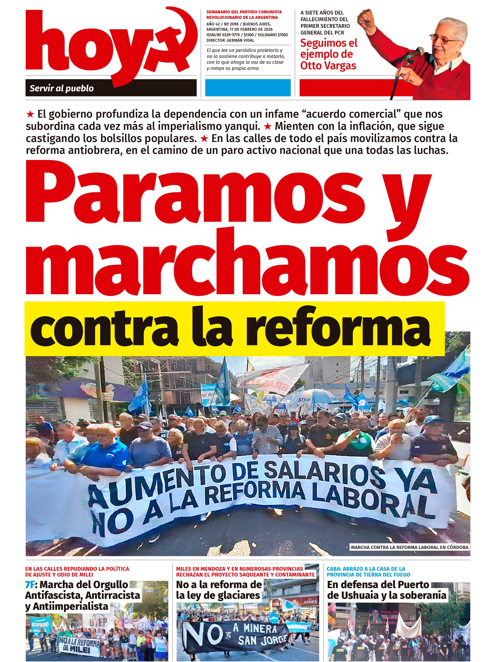 Viernes 13 Febrero 2026 DIFUSIÓN ESPECIAL Fuente: Prensa Partido Comunista Revolucionario (PCR)SEMANARIO HOY N° 2096. HORA POLÍTICA:"PARAMOS Y MARCHAMOS CONTRA LA REFORMA". ESCRIBEN RICARDO FIERRO Y GERMÁN VIDAL Salió la edición del Semanario Hoy N° 2096, el semanario del Partido Comunista Revolucionario (PCR). Hora Política: "Paramos y marchamos contra la reforma". ----------------------------------------------------------------------- "El gobierno profundiza la dependencia con un infame "acuerdo comercial" que nos subordina cada vez más al imperialismo yanqui. Mienten con la inflación, que sigue castigando los bolsillos populares. En las calles de todo el país movilizamos contra la reforma antiobrera, en el camino de un paro activo nacional que una todas las luchas.". --------------------------------------------------------------------- ADEMÁS EN ESTA EDICIÓN: -REFORMA LABORAL: TRABAJAR MÁS Y EN PEORES CONDICIONES. -"ACUERDO COMERCIAL" CON EEUU. -INTERNACIONAL. -SOMOS EL PARTIDO DE OTTO VARGAS. ---------------------------------------------------------------------