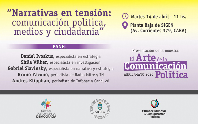 ESPECIAL PARA ENTREVISTAS + COBERTURA MÓVIL Fuente: Prensa Sindicatura General de la Nación (SIGEN) LA SIGEN REALIZARÁ LA MESA DE DEBATE "NARRATIVAS EN TENSIÓN: POLÍTICA, MEDIOS Y CIUDADANÍA" La Sindicatura General de la Nación (SIGEN), realizará el MARTES 14/ABRIL (11:00) en la Planta Baja de su sede (Av. Corrientes 379 - CABA) la mesa debate "Narrativas en tensión: política, medios y ciudadanía", con la participación de especialistas en estrategia, investigación y periodismo que analizarán cómo se construye el sentido en la política actual. GACETILLA | IMAGEN ----------------------------------------------------------------------- El panel será encabezado por el Síndico General de la Nación, Alejandro Díaz. Participarán Daniel Ivoskus, especialista en estrategia; Shila Vilker, especialista en investigación; Gabriel Slavinsky, especialista en narrativa y estrategia; Bruno Yacono, periodista de Radio Mitre y TN; y Andrés Klipphan, periodista de Infobae y Canal 26. ----------------------------------------------------------------------- CONFIRMAR ASISTENCIA A: prensa@sigen.gob.ar -----------------------------------------------------------------------