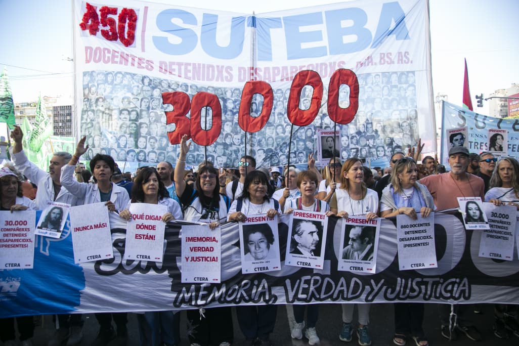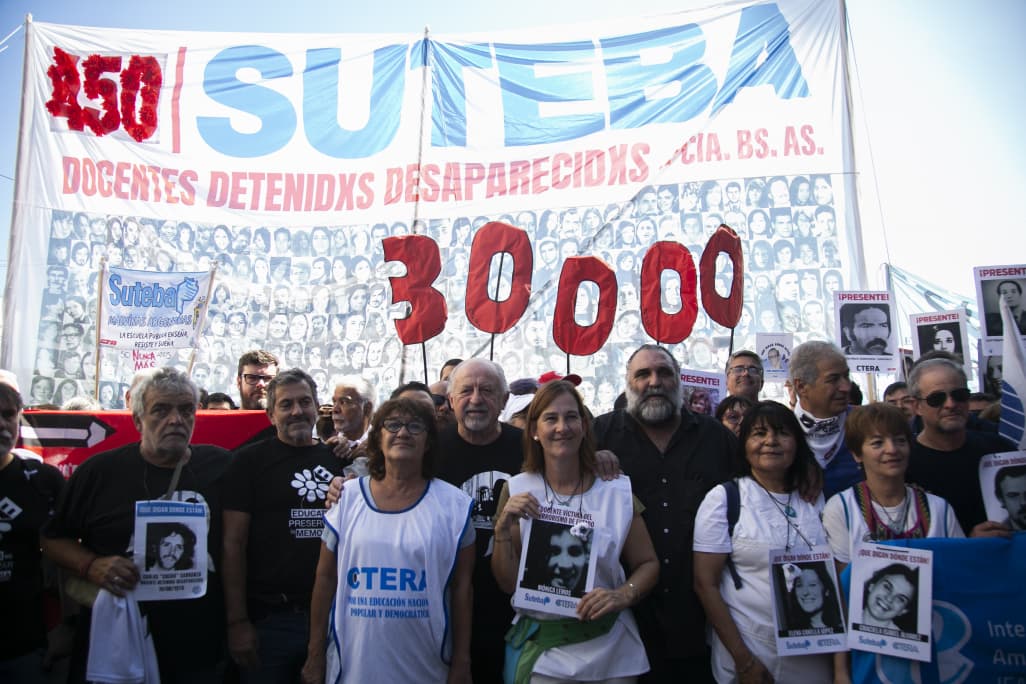 A 50 AÑOS, SUTEBA GRITÓ PRESENTE POR LOS 450 DOCENTES DETENIDOS DESAPARECIDOS DE BUENOS AIRES Y LOS 30.000 Bajo las consignas de Memoria, Verdad y Justicia, el SUTEBA participó de la masiva movilización del martes 24 de marzo a la Plaza de Mayo, integrando la columna de la CTA-T y la CTERA, y junto a los organismos de Derechos Humanos, para repudiar el golpe cívico militar de 1976. GACETILLA | IMÁGENES: 01 02------------------------------------------------------------------------ Roberto Baradel (Sec. Gral del SUTEBA): ""Es un orgullo estar este 24 de marzo en la Plaza, a 50 años del inicio de esa dictadura cívico militar genocida, estamos los trabajadores hermanados recordando a nuestros compañeros, a los 30.000. Exigimos también, como hacen las Madres y las Abuelas, que digan dónde están nuestros compañeros, porque nuestro compromiso es seguir peleando para construir la Argentina que ellos soñaron".