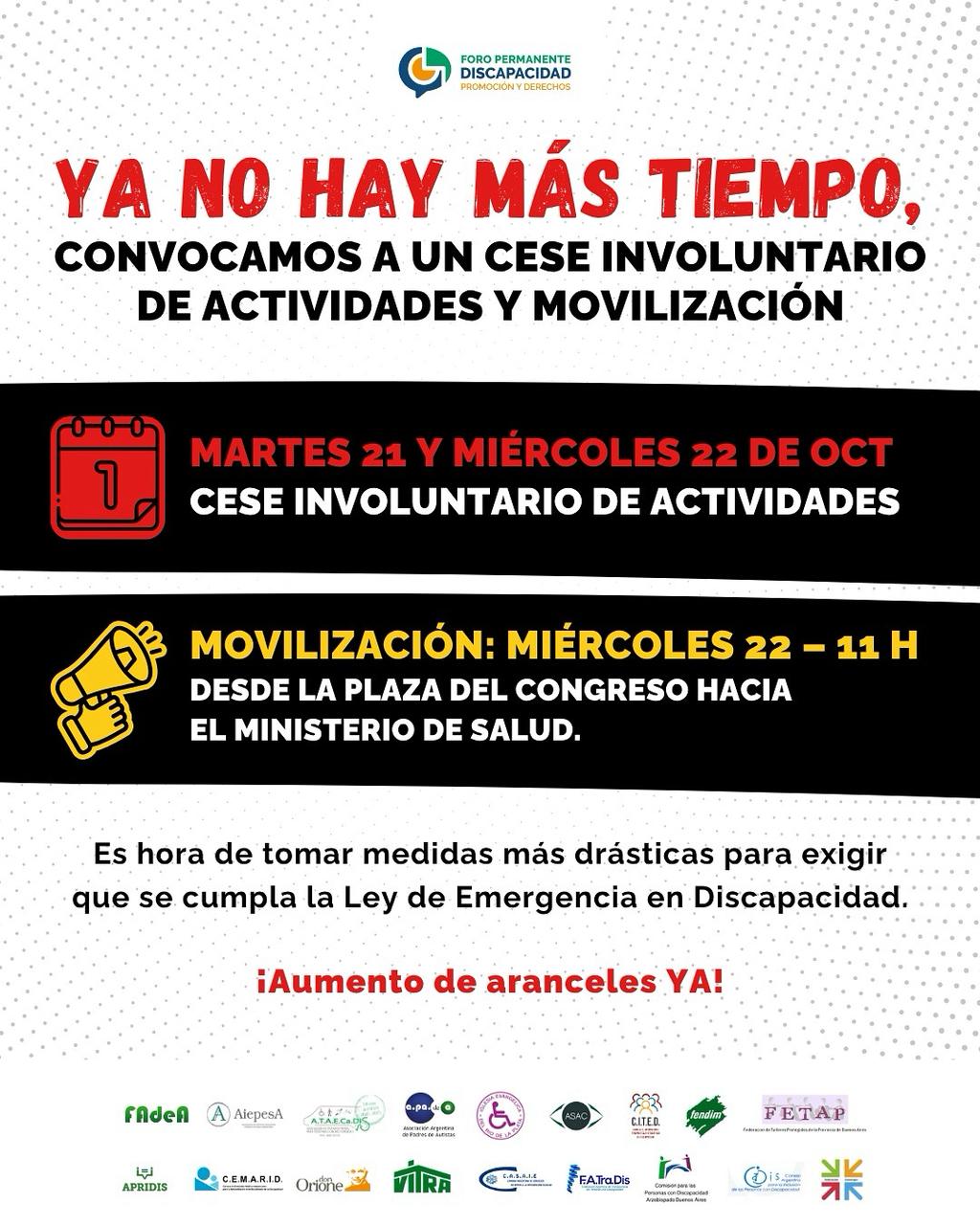 Miércoles 22 Octubre 2025 11:00 | CAPITAL FEDERAL Fuente: Prensa Foro Permanente Discapacidad EL FORO PERMANENTE DISCAPACIDAD MARCHARÁ DE PLAZA CONGRESO AL MIN. DE SALUD Las organizaciones que integran el "Foro Permanente Discapacidad" realiza un cese involuntario de actividades y llevará adelante una marcha de Plaza Congreso al Ministerio de Salud de la Nación; en reclamo del cumplimiento de la Ley de Emergencia en Discapacidad aprobada por el Congreso. GACETILLA | IMAGEN ----------------------------------------------------------------------- "Esta decisión fue adoptada tras los hechos ocurridos el viernes 17 de octubre en la Agencia Nacional de Discapacidad (ANDIS), donde las personas con discapacidad, familias y prestadores del sector fueron nuevamente objeto de maltrato y ausencia de respuestas concretas a los reclamos. Ante la falta de avances y el deterioro en las condiciones de atención, acompañamiento y financiamiento, las organizaciones entendemos que ya no podemos esperar más. Es necesario tomar medidas firmes para exigir que se garanticen los derechos de las personas con discapacidad, se cumpla la Ley de Emergencia en Discapacidad y se dé una respuesta a la crisis terminal que atraviesa el sector..." ----------------------------------------------------------------------- Lugar 1: Plaza Congreso Lugar 2: Ministerio de Salud de la Nación ----------------------------------------------------------------------- CONTACTO P/NOTAS: -Lucía Tasso, 115-700-7081 (Prensa) -----------------------------------------------------------------------