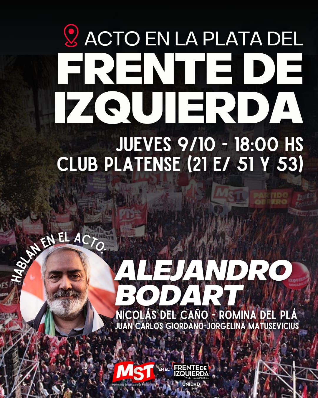 El Frente de Izquierda realizará su acto de cierre de campaña de Provincia y CABA frente a la Embajada de EEUU. Entre los principales oradores junto a Myriam Bregman y Nicolás del Caño, lo harán el actual diputado nacional Juan Carlos Giordano (Izquierda Socialista/FIT Unidad), candidato a renovar su banca por Pcia. de Bs.As. y la diputada nacional Mercedes de Mendieta (Izquierda Socialista/FIT Unidad), candidata a renovar su banca en CABA. GACETILLA | IMÁGENES: 01 02 ---------------------------------------------------------------------- Mercedes de Mendieta y Juan Carlos Giordano: "Solo el Frente de Izquierda Unidad llama a derrotar el pacto colonial de Milei con Donald Trump, que traerá más entrega y sometimiento. Denunciando que el promocionado salvataje será para los bancos y los usureros internacionales, no para el pueblo trabajador. Este 26 de octubre llamamos a votar al FIT Unidad para romper las cadenas con EEUU y el FMI". ---------------------------------------------------------------------- Lugar: Embajada de EEUU, Av. Colombia 4300 ---------------------------------------------------------------------- CONTACTOS P/NOTAS: -Mercedes De Mendieta, 116-542-5363 -Juan Carlos Giordano, 113-119-3003 -Prensa de Izquierda Socialista, 116-054-0129 ----------------------------------------------------------------------
