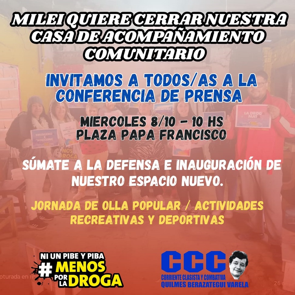 Miércoles 22 Octubre 202515:00 | CAPITAL FEDERAL Fuente: Prensa Partido de los Trabajadores Socialistas (PTS) PROTESTA DE JUBILADOS FRENTE AL CONGRESO Y CONFERENCIA DE PRENSA Organizaciones de Jubilados, entre ellas Jubilados del PTS, realizarán una nueva manifestación frente al Congreso y en ese marco darán una conferencia de prensa. GACETILLA ------------------------------------------------------------------------- "En medio de la campaña electoral los y las jubiladas decimos: Fuera el imperialismo yanki de Argentina; Basta de defender la gobernabilidad y permanencia de Milei. El pacto de Milei con el FMI y el salvataje de Trump impone a la Argentina un brutal endeudamiento y coloniaje. Exigen una reforma laboral y jubilatoria. Aumento de la edad, rebaja de los haberes, impedimento del derecho jubilatorio a trabajadores precarizados, privatización del sistema, robo definitivo del FGS. La inflación y la devaluación inminente hundirán aún más a los jubilados y adultos mayores. Es necesaria la huelga general para terminar con este gobierno y con quienes lo apoyan. Aumento inmediato de las jubilaciones y Pensiones. Moratoria para quienes los patrones no aportaron. Devolución del PAMI, los medicamentos y tratamientos a los jubilados y trabajadores..." ------------------------------------------------------------------------- Lugar: Frente al Congreso ------------------------------------------------------------------------- CONTACTOS P/NOTAS: -Manuel Gutiérrez, 115-484-3874 -Nora Biaggio, 113-165-1321 -Alicia Navarro, 116-351-4381 -------------------------------------------------------------------------
